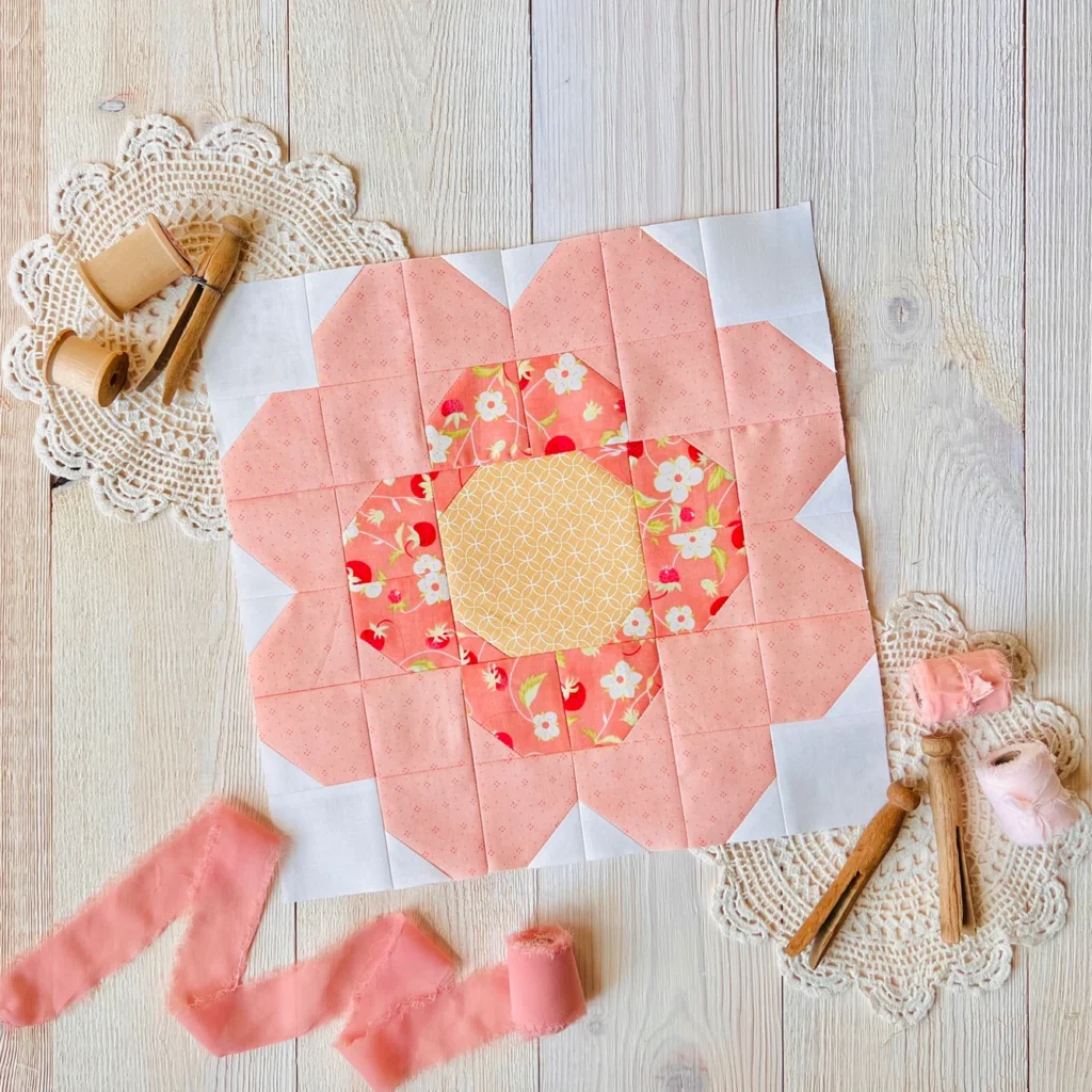 The HST-Free Pumpkin Blossom Block is a delightful quilting design that captures the beauty of pumpkin blossoms without the complexity
